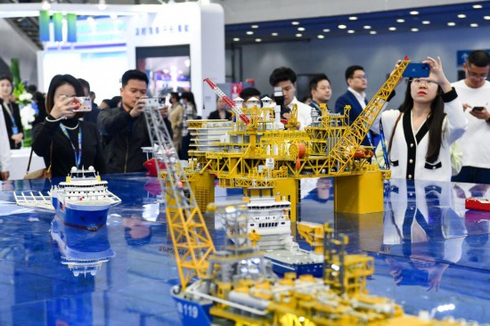 11月23日,观众在现场观看中集集团展出的蓝鲸1号钻井平台模型。(新华社记者 梁旭 摄)